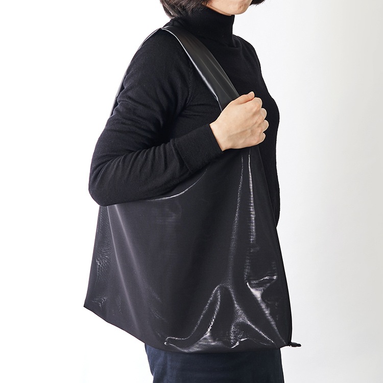 素材を主役にした、シンプルで機能的なデザイン。スイムメッシュブラックの生地は、水泳帽のメッシュとエナメル合皮の重ね仕立てです。見る角度によって立体的なモアレが起きることによって、水面のようにキラキラ光ってエレガントな表情が生まれます。 持ち手は太く柔らかいので、荷物を軽く感じるうえに、肩から滑り落ちにくいのがうれしいポイント。ファスナー付き外ポケットのほか、内側には3か所にポケットが付いています(うち1か所はファスナー付き)。大容量なので、ショッピングや仕事用のバッグとしてもおすすめです。 底面でスナップボタンを留めると立体的なフォルムに変身。※画像はメッシュWBです。