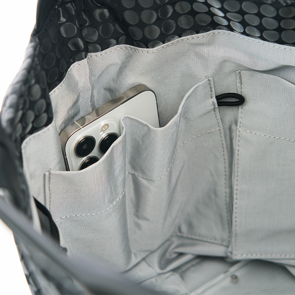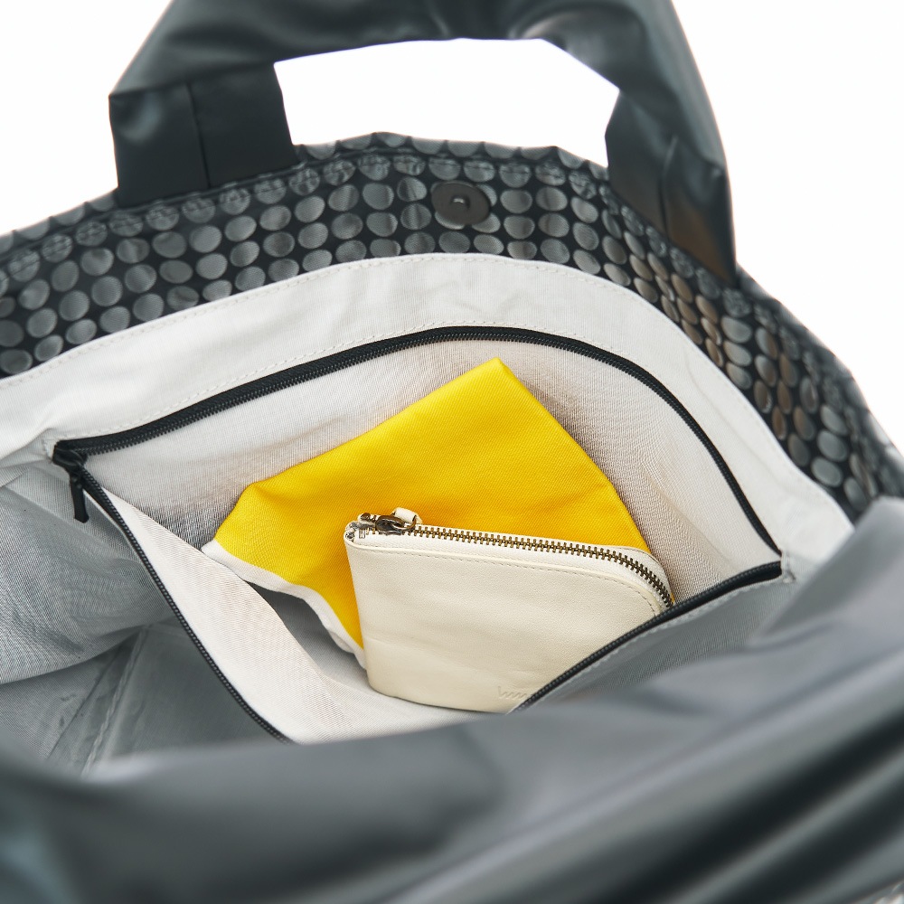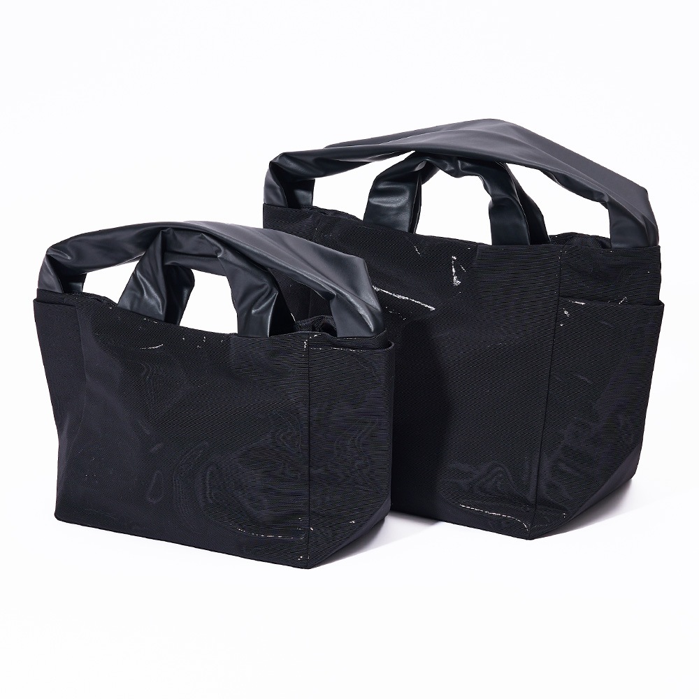 m bag 2way+ Swim mesh Blackエムバッグ 2wayプラス スイムメッシュブラック 肩掛けにも手持ちにもなる2wayトートバッグ素材を主役にした、シンプルで機能的なデザイン。スイムメッシュブラックの生地は、水泳帽のメッシュとエナメル合皮の重ね仕立てです。見る角度によって立体的なモアレが起きることによって、水面のようにキラキラ光ってエレガントな表情が生まれます。 |