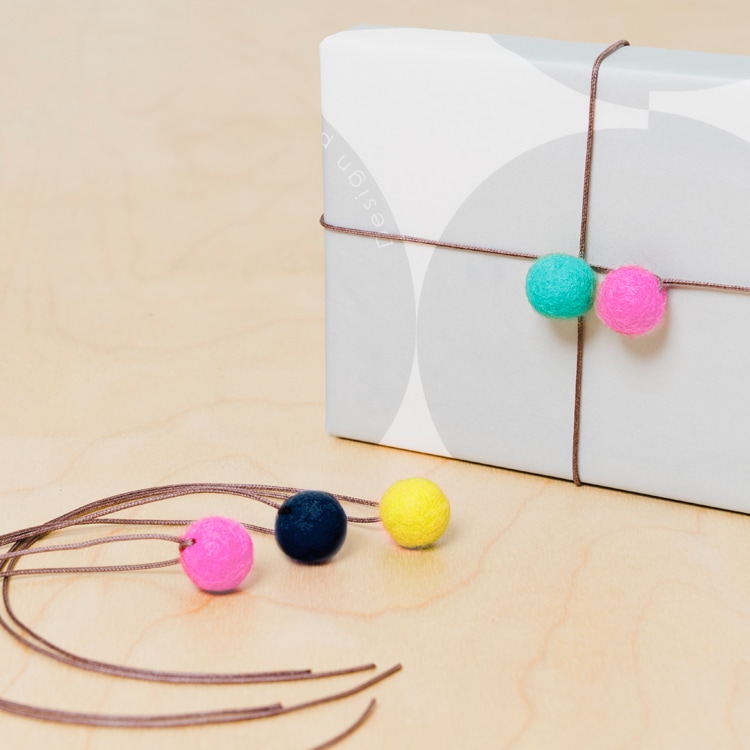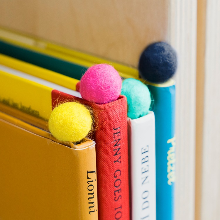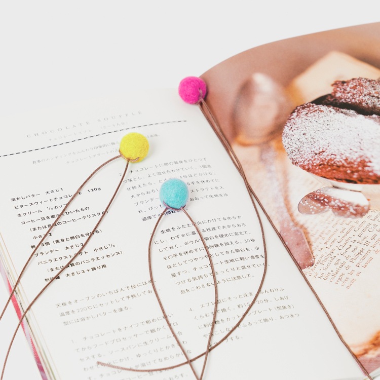 フェルトの飾りがついたシンプルなブックマークです。紐が2本ついているので、抜け落ちにくく2箇所同時に挟んでおくことができます。 カラーは全部で4色。本の上からまあるいフェルトが出て可愛らしいブックマークです。
