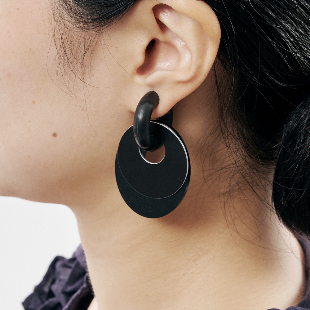 同ブランドのイヤリング、パーツと組み合わせて使えるイヤリングパーツです。薄いアルミニウムに塗装を施したパーツは、存在感があるのにとても軽量で耳が疲れません。写真は、2120 Gum earring ブラックに2181 earring parts (OVBK)と2019 earring parts aluminium (BK)を重ね付けしています。 ※こちらはパーツのみの販売です。イヤリングは別売りとなっております。 お気に入りのパーツを見つけてカスタマイズしてみてください。