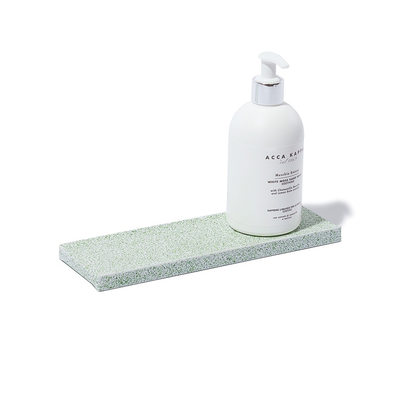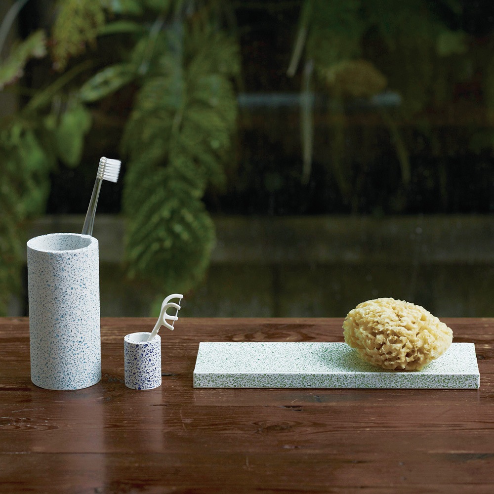 調湿性や吸水、脱臭性に優れ、呼吸する素材としても注目される土の特性をそのままに、自然の恵みを凝縮させたナチュラルで心地のよいデザインが特徴です。珪藻土が水を吸水して乾燥を早め、洗面台まわりの物を清潔に保ちます。廃棄ガラス瓶を粉砕し、左官の伝統技法「洗い出し」により、美しいテクスチャにまで仕上げられるのは、歴史と伝統に培われた技をもつsoilならでは。廃材とは思えない、素材の美しさが際立ちます。
