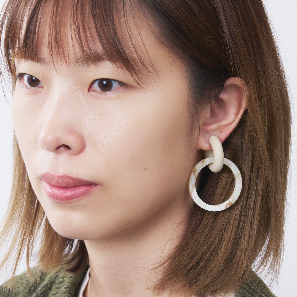 acrylicのGumイヤリングと組み合わせて楽しむイヤリングパーツ。“Sur(サー)”とのコラボレーションモデルです。アクセサリーブランド Surは「めがねのまち」として知られる福井県鯖江市で眼鏡フレームの素材の端材活用をきっかけに生まれました。素材のセルロースアセテートは、綿花やパルプから作られる植物由来樹脂。石油系プラスチックと違い、肌にそっと馴染む優しさと軽さが魅力です。マーブルホワイトは、白とクリームベージュ、茶色のマーブル模様が大理石のような上質感を演出します。 デザインを手掛ける “TSUGI(ツギ)” は、福井県鯖江市を拠点に活動するローカルクリエイティブカンパニー。TSUGIという名前は “次” の時代に向けて、その土地の文化や技術を“継ぎ”、新たな関係性を “接ぐ” という思いが込められています。 ※この商品はパーツのみです。イヤリング(2120 Gum earring)は別売りです。 ※模様の出方は個体差があります。 お気に入りのパーツを見つけてカスタマイズしてみてください。