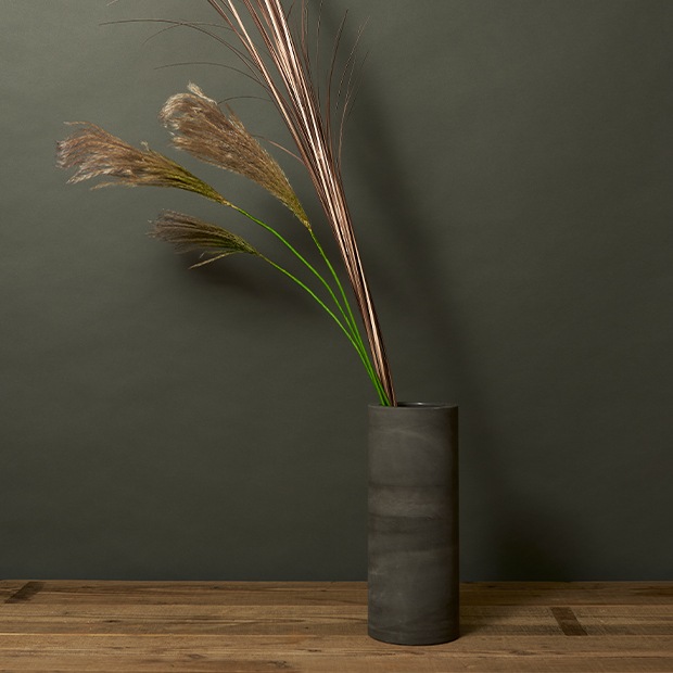 「墨流し」技法による石のような独特な色合いのフラワーベース。長さのある枝物も安定して生けることができます。手軽に水かえできる、ガラスシリンダー入りです。グレーとブラックの2色展開。生ける花材を引き立て、Japandiをはじめさまざまなインテリアに調和します。「墨流し」のフラワーベースは、L・LL・Wの3サイズ展開です。