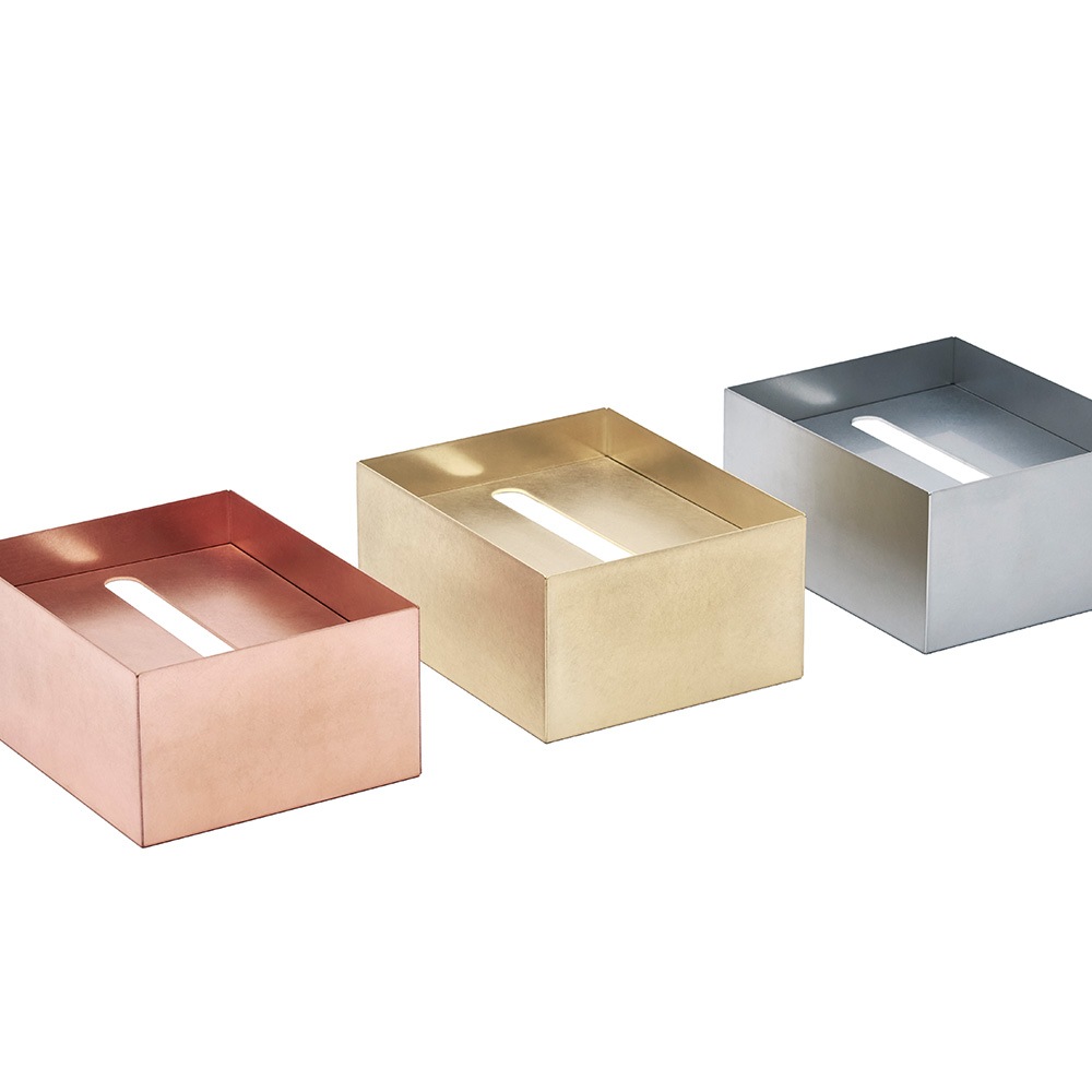 溶接加工を一切施さず、精密板金加工による曲げのみで成形された「Ori」シリーズのティッシュケースのハーフサイズ。素材それぞれの弾性などの特性を計算し、寸法や曲げを0.1mm単位で調整。精密板金だからこそできる、シンプルで美しい形状が特徴です。場所をとらずムダなく使えることで人気のハーフサイズティッシュのためのケース。卓上や洗面台などに置いても美しく調和します。
