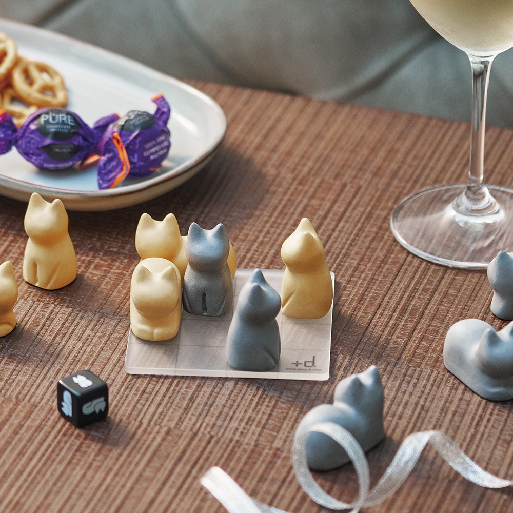 茶と灰の駒を交互にボードに置いていき、縦・横・斜めにネコを4マス並べられた方が勝ち。「ネコができないこと」に注意しながら、ボードの上をネコでいっぱいにしましょう。ポーズが描かれたサイコロを使うとさらに楽しみ方が広がります。負けた人は手元に残ったネコの数だけ「ニャー」と鳴きましょう。